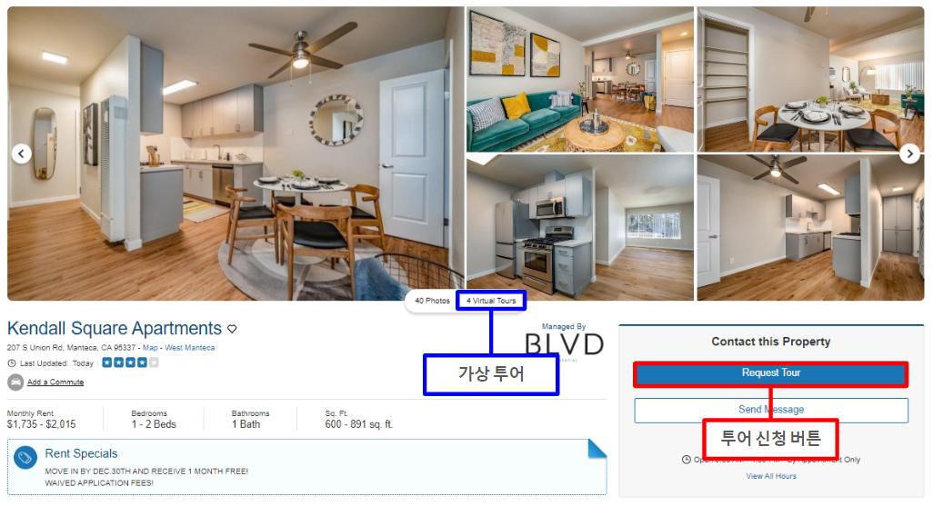 이 중에서 맘에 드는 아파트 혹은 집을 선택하여 투어를 신청할 수 있다.
